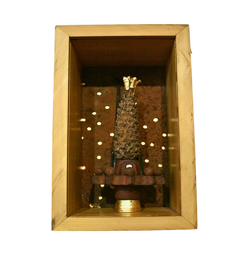 This worn Banksia nut is adorned with 24ct Gold Leaf. Its pedestal is from a Gold Leaf base on which sits a discarded machine gear embellished by the addition of a collection of oxidised ball bearings. The background is perforated rusted steel over further 24ct Gold Leaf. The ladder from fabricated mild steel assists in “access” to the crown of the banksia