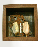 The first in a series of boxes exploring the settings in which each shell adapts itself to the environment provided. This shell has an implant of “blistered” mild steel with a background of oxidised steel.